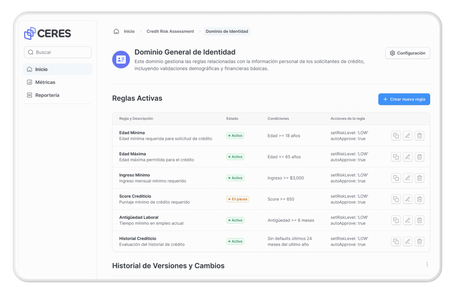 Ceres unifica todo el proceso de gestión de reglas en una experiencia visual, colaborativa y gobernada.